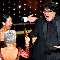 봉준호 감독이 지난 10일 제92회 아카데미 시상식에서 ‘기생충’으로 작품상 트로피를 받으며 환하게 웃고 있다. LA_ 로이터연합뉴스